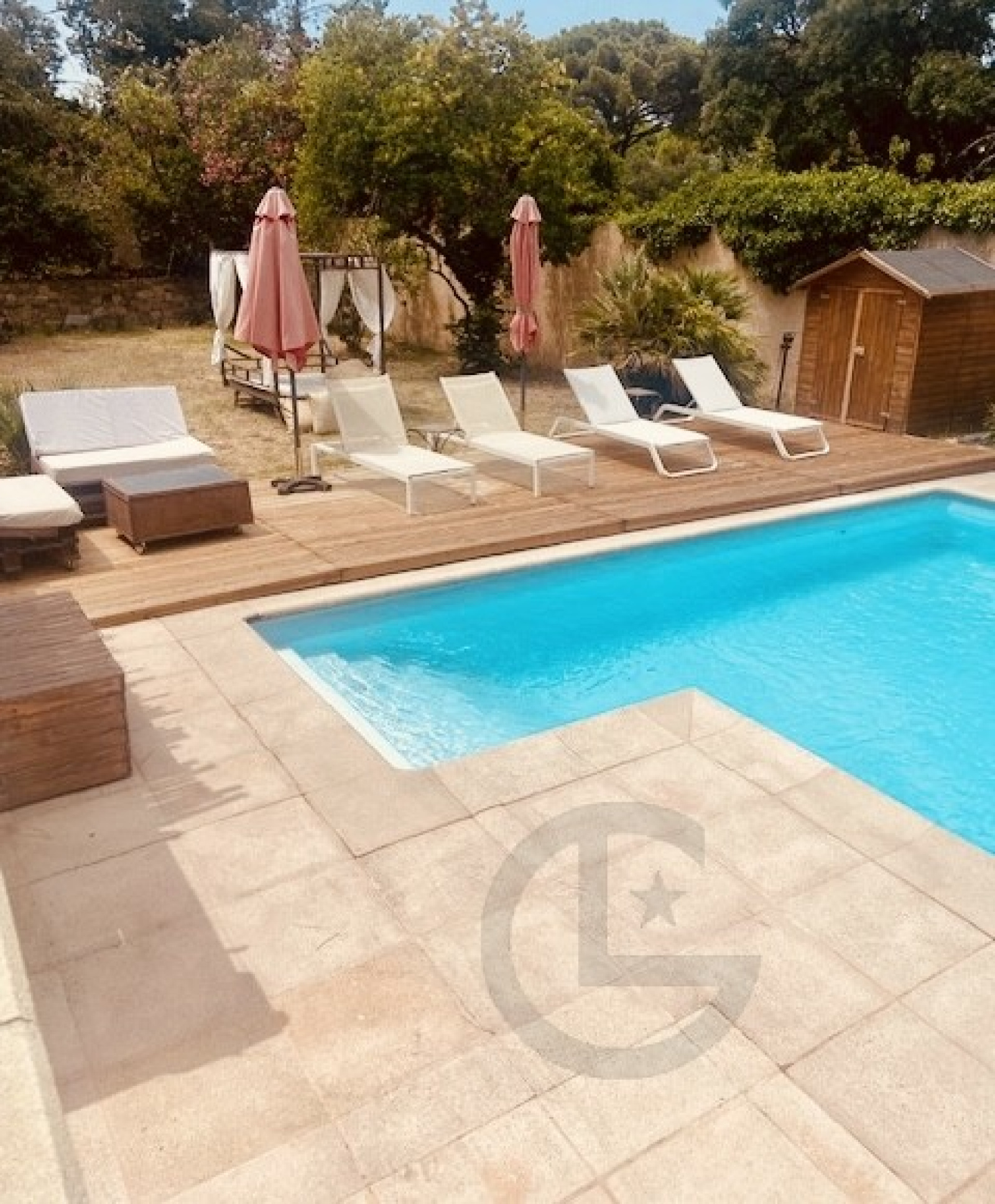 Piscine traditionnelle de 11,5x5,5 m2 et sa plage pour transats et bed, cuisine d'été avec barbecue et four à pizza,